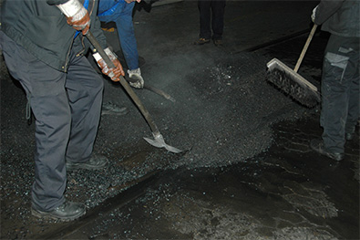 | Übrig bleibt etwas Schlacke, das mit vereinten Kräften in die vorgesehenen Behälter geschaufelt wird. | ||||||||||||||