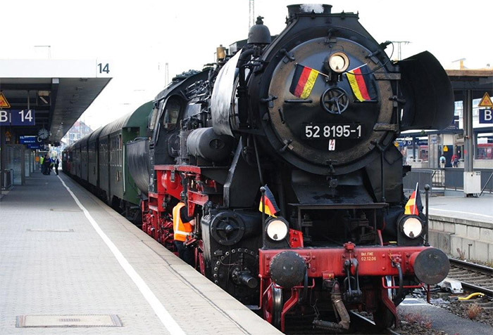 Anlässlich des Johannes Scharrer Bahnhofsfestes waren wir von Nürnberg nach Neuhaus Pegnitz Auch unsere Dampflok war aufgrund der Fußballweltmeisterschaft dementsprechend beflaggt. Trotz großer Hitze kam unser Lokpersonal nicht sonderlich zum schwitzen. |