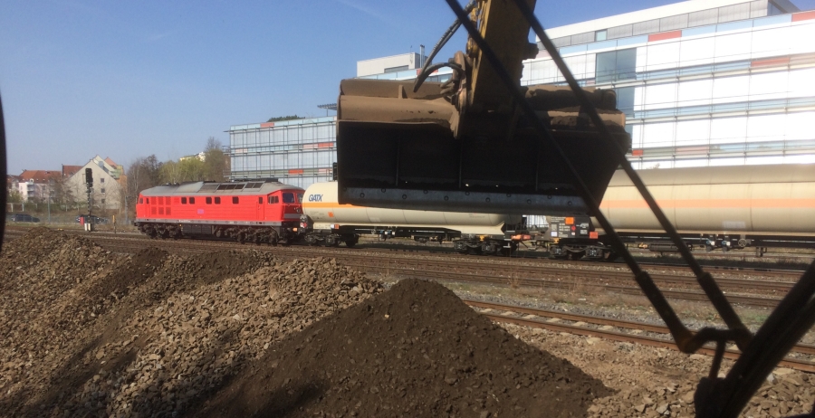 Mehrere Tage waren wir mit unserem Zwei-Wege-Bagger auf einer Gleisbaustelle tätig. Rund um die Uhr musste angeliefertes Aushubmaterial sortiert und aufgehäuft werden.
