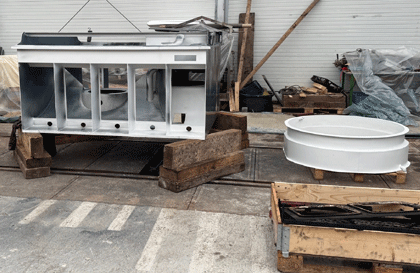 Nachdem der Kühlerrahmen instandgesetzt wurde konnte dieser nun zusammen mit ein paar Rohrleitungen zum Sandstrahlen verschickt werden. Ebenso wie der erste Wassertank wurde auch der zweite Wassertank, der unter dem Kühler wieder eingebaut werden muss, für das Sandstrahlen vorbereitet. Dafür musste das Deckblech aufgetrennt und der Tank somit geöffnet werden. Vor dem Sandstrahlen mussten die über viele Jahre entstandenen Kalk- und Dosierablagerungen mechanisch entfernt werden. Auch der Öltank wurde soweit für das sandstrahlen vorbereitet und verschickt. |