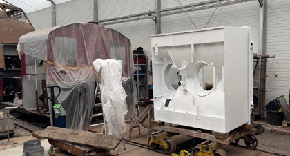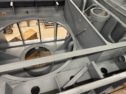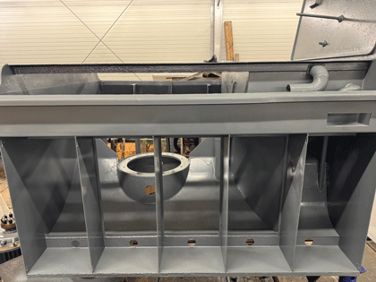 | Nachdem der Wassertank fertig vorbereitet wurde, konnte dieser nun zum Sandtrahler, und der Kühlerrahmen bereits fertig gestrahlt und grundiert abgeholt werden. Parallel wurde begonnen altes Außenblech am zerlegten Maschinenraum herauszutrennen. Wie auch die Erfahrungen am ersten Kühler zeigten, haben wir auch hier zum Teil neue Buchsen angefertigt und sämtliche Lager und Dichtungen neu beschafft. Die beiden Elektromotoren sind zwischenzeitlich auch von der Überholung wieder bei uns eingetroffen. |