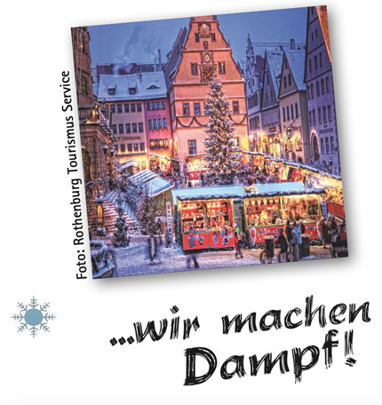 Am 1. Advent führt die Fahrt mit der Dampflok 52 8195-1 und historischen Wagen aus den 30er und 50er Jahren des letzten Jahrhunderts von Fürth Hbf, Nürnberg Hbf auf der Hauptstrecke nach Roßtal Bhf, Heilsbronn und weiter über Wicklesgreuth, Ansbach bis Steinach bei R.o.d.T.. Von dort geht es über die Nebenbahn in die alte Reichsstadt Rothenburg ob der Tauber.
