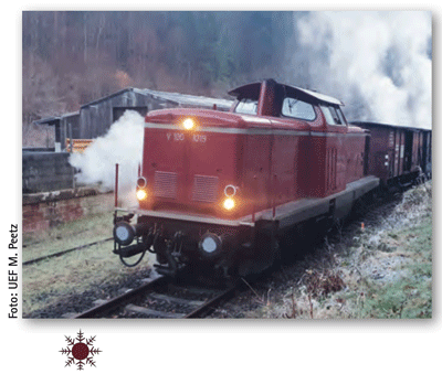 Am 2. Adventssonntag vertritt die Diesellok V100 1019 unsere 52 8195, die sich noch in der Revision befindet. Zusammen mit unseren historischen Wagen aus den 1930er und 1950er Jahren geht es im beheizten Sonderzug von Fürth Hbf, Nürnberg Hbf auf der Hauptstrecke nach Roßtal, Heilsbronn und weiter über Wicklesgreuth und Ansbach bis Steinach bei R.o.d.T.
